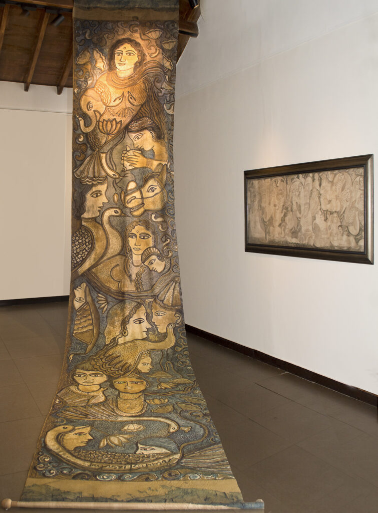In Jayasri Burman’s world, the inner sanctum opens to myth and river. A large painted scroll